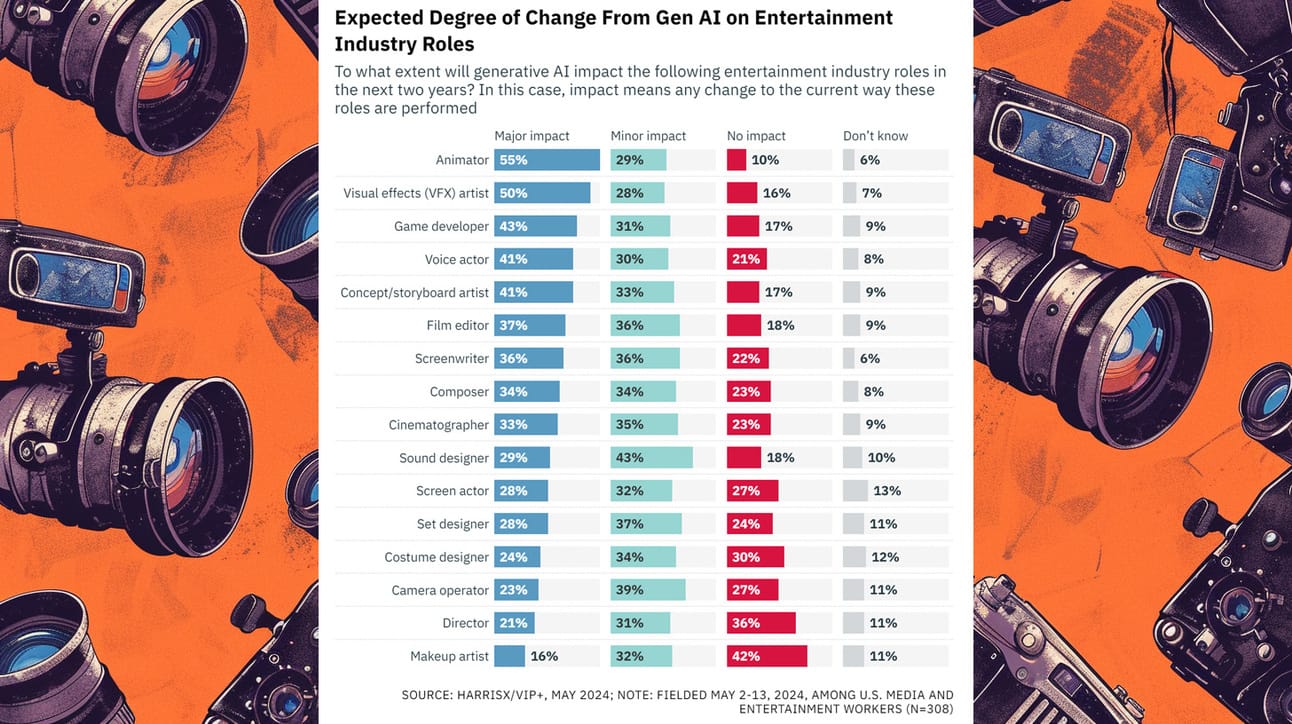VIP+ and HarrisX survey shows generative AI to significantly impact film and TV production jobs like animators and VFX artists.